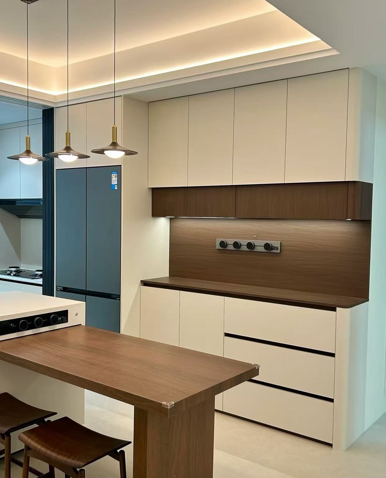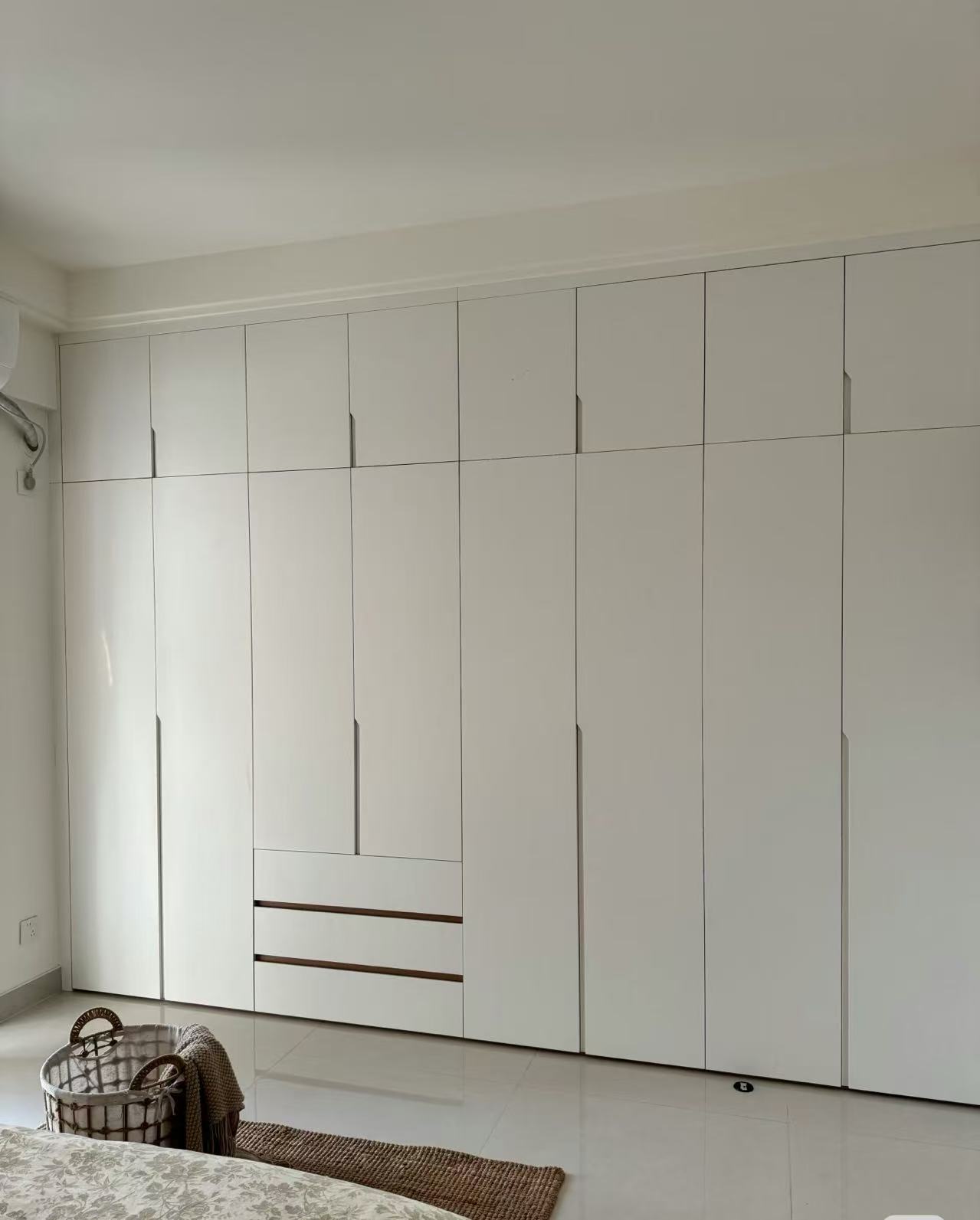 放弃传统矮柜,定制从地面直达天花板的柜体,直接解锁50%以上的额外收纳容量。客厅可做整面墙电视柜,封闭柜体收纳零食、玩具、闲置家电,开放格摆放装饰摆件;卧室打造顶天立地衣柜,内部划分挂衣区、叠放区、抽屉区,顶层高柜专门存放换季被褥、行李箱等不常用物品,彻底告别衣物堆积的烦恼;厨房定制顶天立地高柜,把烤箱、微波炉等小家电和米面油、闲置厨具统统收纳,让台面只留常用的锅碗瓢盆,整洁度瞬间翻倍。
