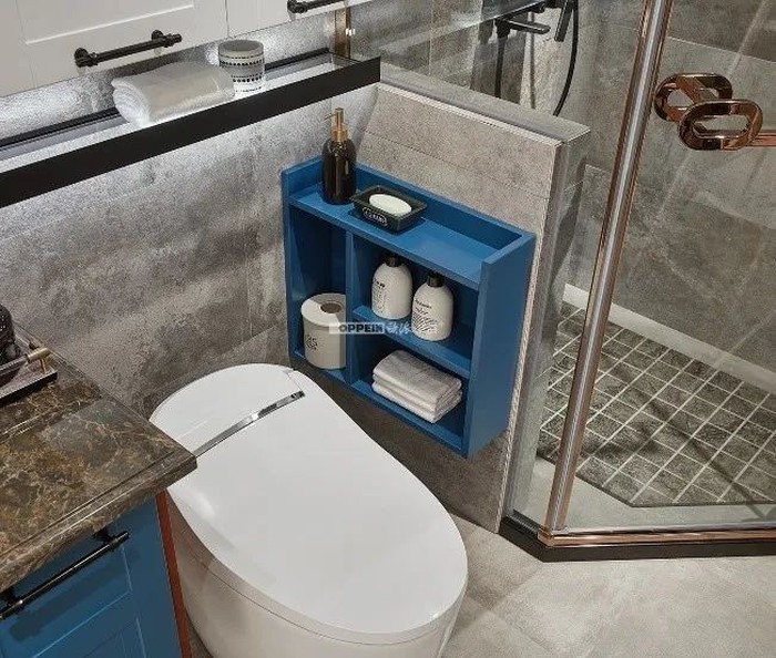 上厕所的时候要不手机没处放,要不就是纸巾忘记带!利用马桶侧边空间安装侧边吊柜,放手机、纸巾刚刚好,既为浴室充分扩容,也能让如厕更自如。