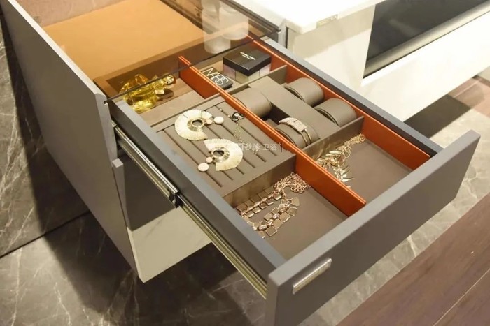 抽屉里安装一个金属分隔件,虽然只是一个小小的配件,但巧妙划分了许多空间,将日常所需物品合理收纳其中,提高抽屉内的空间利用率。